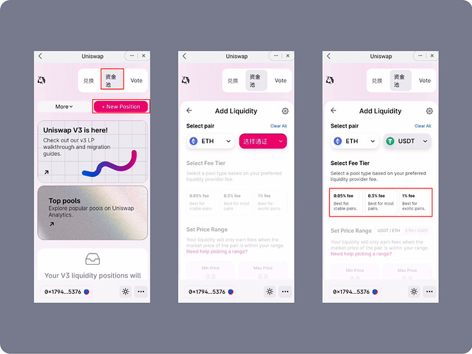 1.点击「资金池」-「+ New Position」,选择要添加的代币并设置手续费费率。0.05% 适合稳定币交易对,0.3% 适合常规资产交易对,1% 适合小众资产交易对。