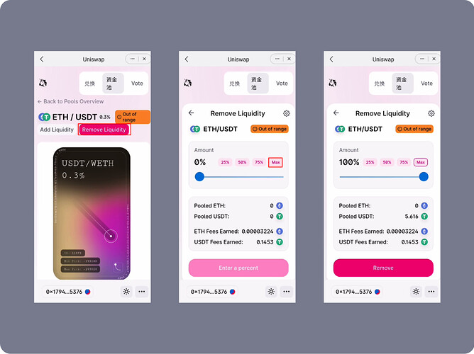1.同上面兑换教程先在 DApp 浏览页面找到并打开 Uniswap,切换至资金池页面。接着点击「Remove Liquidity」,输入要退出流动性的资金数额,如果要全部退出,点击「Max」即可,然后点击「Remove」。