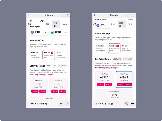 2.设置价格区间。Min Price 是最低价,Max Price 是最高价,Current Price 是当前该资金池中的成交价(即当前汇率)。根据自己想要提供流动性的价格区间设置对应的 Min Price 和 Max Price 即可。