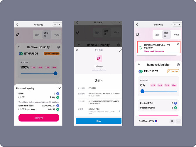 2.在弹出的流动性移除详情页中再次点击「Remove」-「确认」,交易发出后需要等待处理。成功后,即可在 Uniswap 的资金池页面看到提示。回到 imToken 资产页面也会看到同步更新的资产数额。