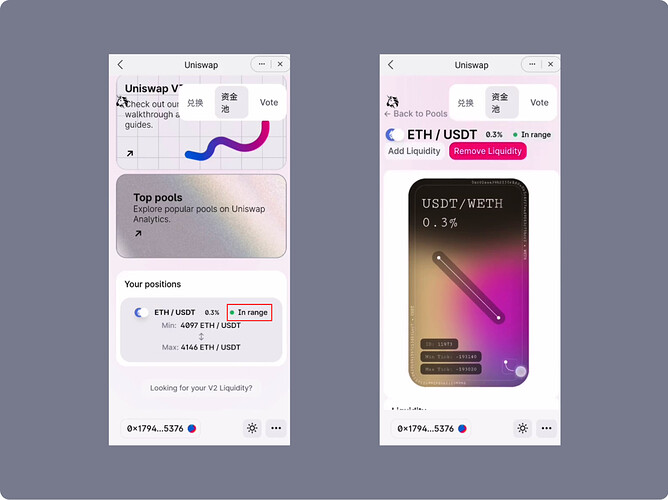 5.点击「In range」即可查看在 Uniswap v3 存入流动性获取的 NFT(即流动性凭证),该 NFT 是一张动态的图片,展示了交易对、手续费率、ID 和价格区间等信息。