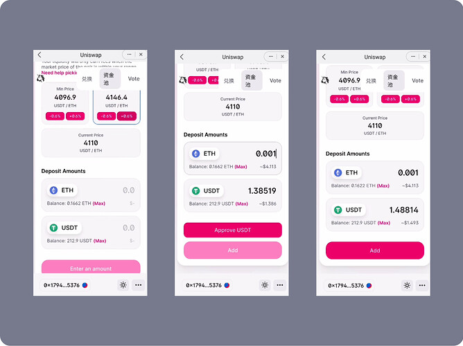 3.设置要投入的代币数量。如果你是第一次提供某币种的流动性,则需要先对该币种进行授权。图中以 USDT 为例,点击「Approve USDT」进行授权,授权成功后再点击「Add」进入下一步。