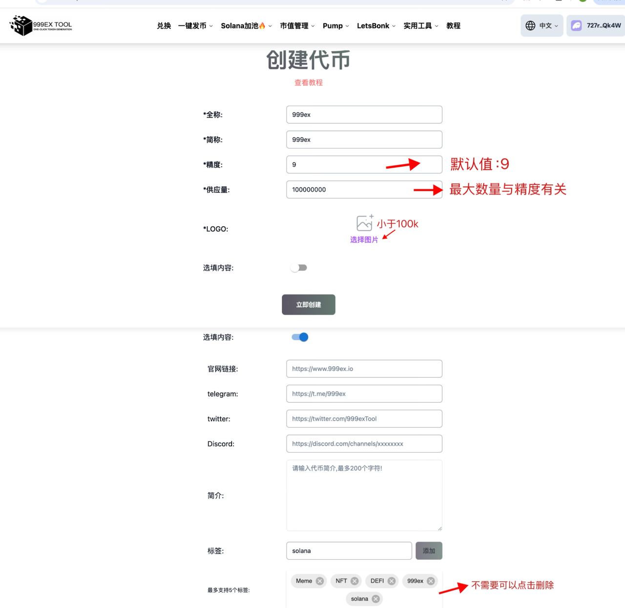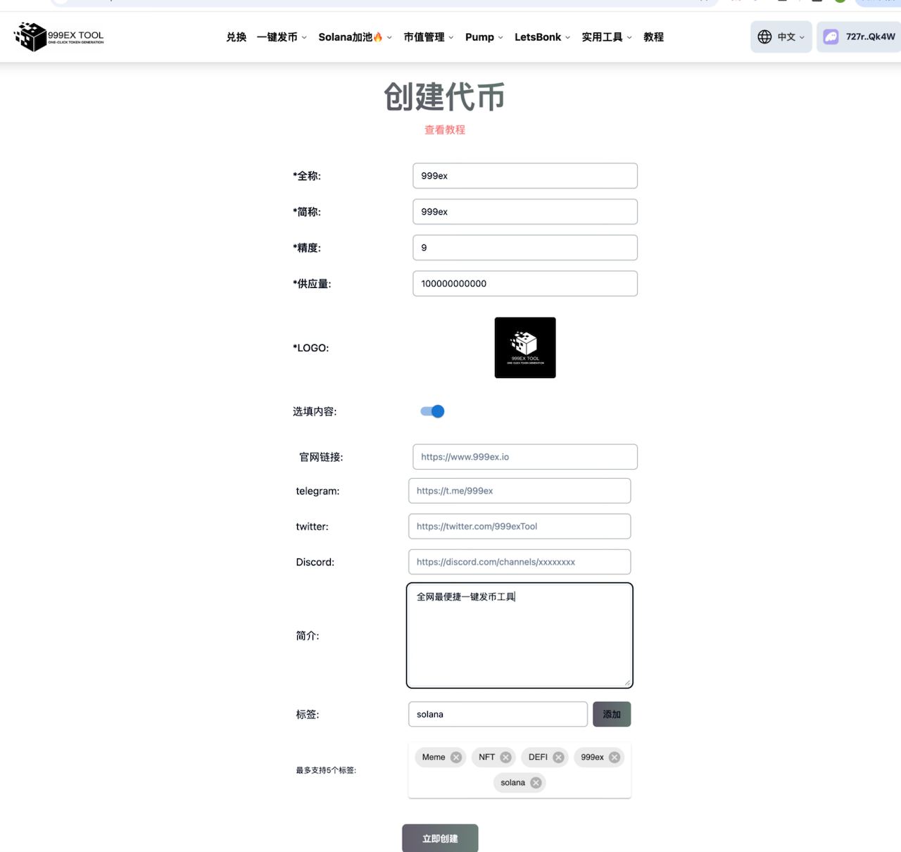这个代币的名字就叫999ex，除了Discord没有填之外，其他都填了。标签是默认的5个，大家可也可以根据自己需要删除或者增加。