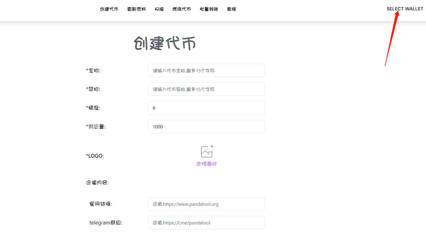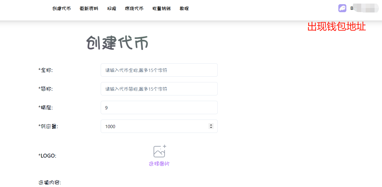 完成钱包链接之后，接下来需要填写代币参数，具体有如下几项：