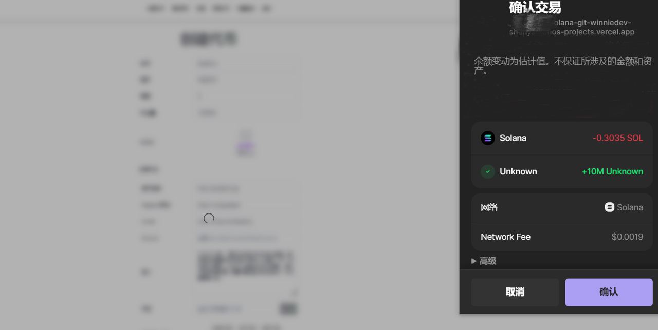 确定好信息无误之后，点击“立即创建”按钮，这时候会跳出Phantom钱包，确认并支付费用即可，如下所示：